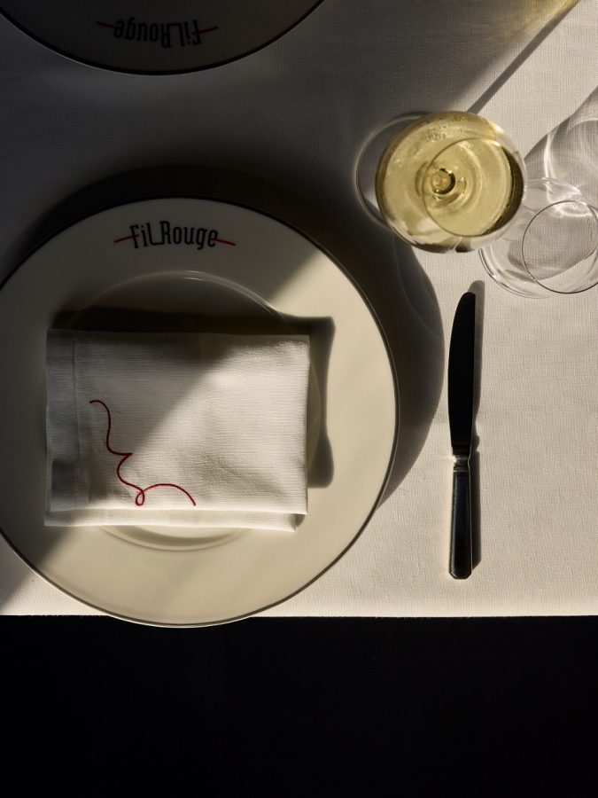 Das Fil Rouge bietet ein zeitloses, elegantes Restauranterlebnis. Die kunstvollen Sechsecke – Ausdruck reinster Perfektion – stehen im Kontrast zu den klaren weißen Wänden, die mit inspirierenden Kunstwerken geschmückt sind.