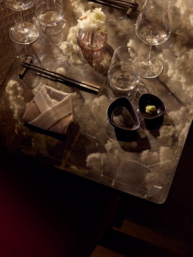 Die Location greift das reiche kulturelle Erbe Japans auf und kombiniert es mit verschiedenen japanischen Designelementen, um ein intimes und einladendes Ambiente zu kreieren. Die alten Teestuben Kyotos haben die Ästhetik des Sakura inspiriert – hier leiten dunkle Holzrahmen Ihren Blick zur Decke, die mit blühenden Zweigen bedeckt ist und gemeinsam mit den Lichterketten für ein warmes Ambiente sorgt.